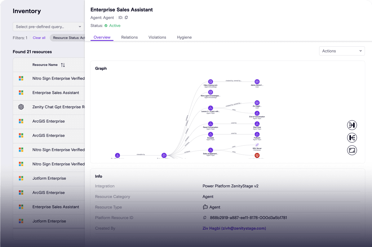 Zenity provides deep visibility into every agent configuration and action. With unified graph intelligence, Zenity maps agent relationships, dependencies, and attack paths everywhere.
